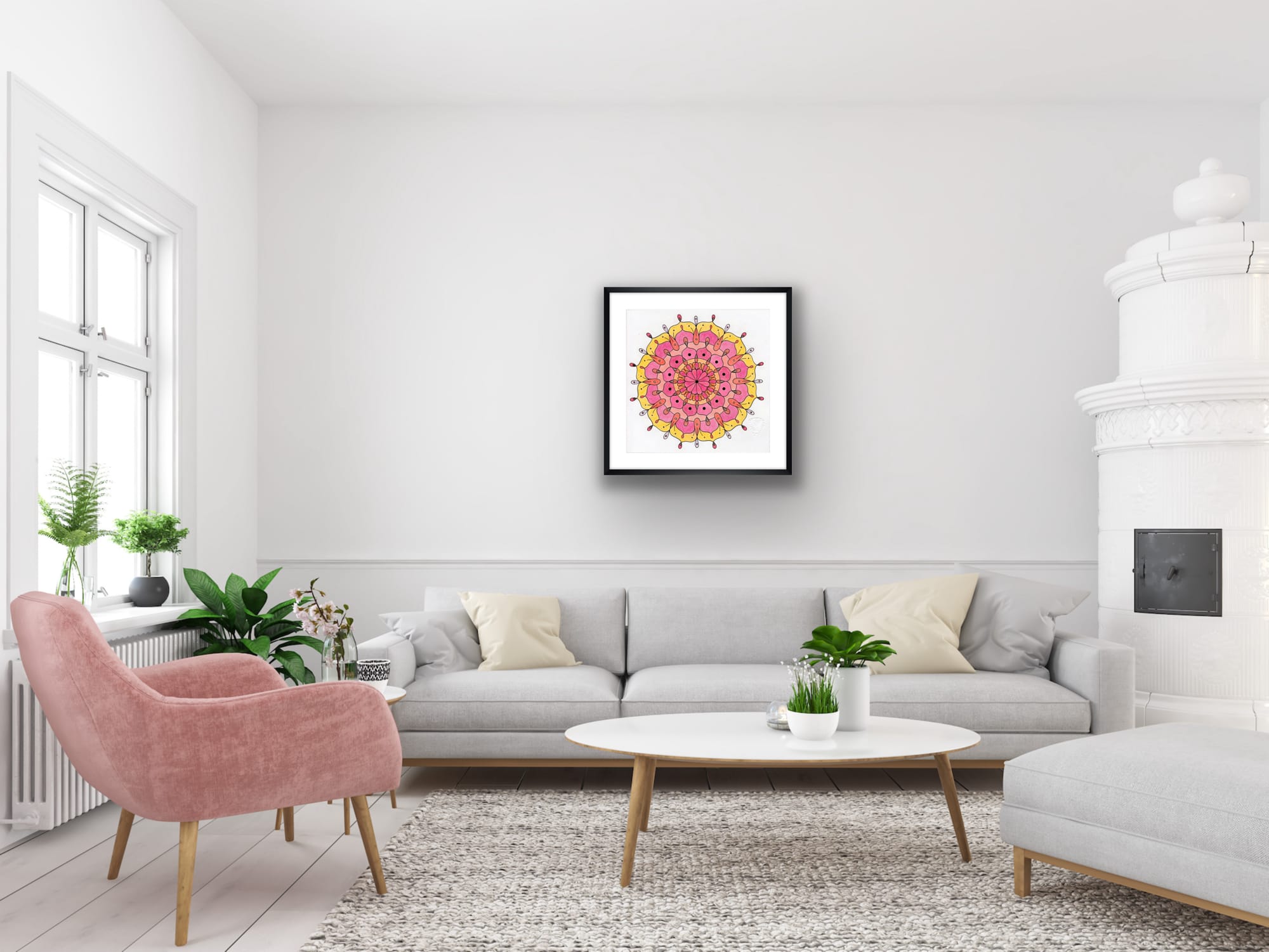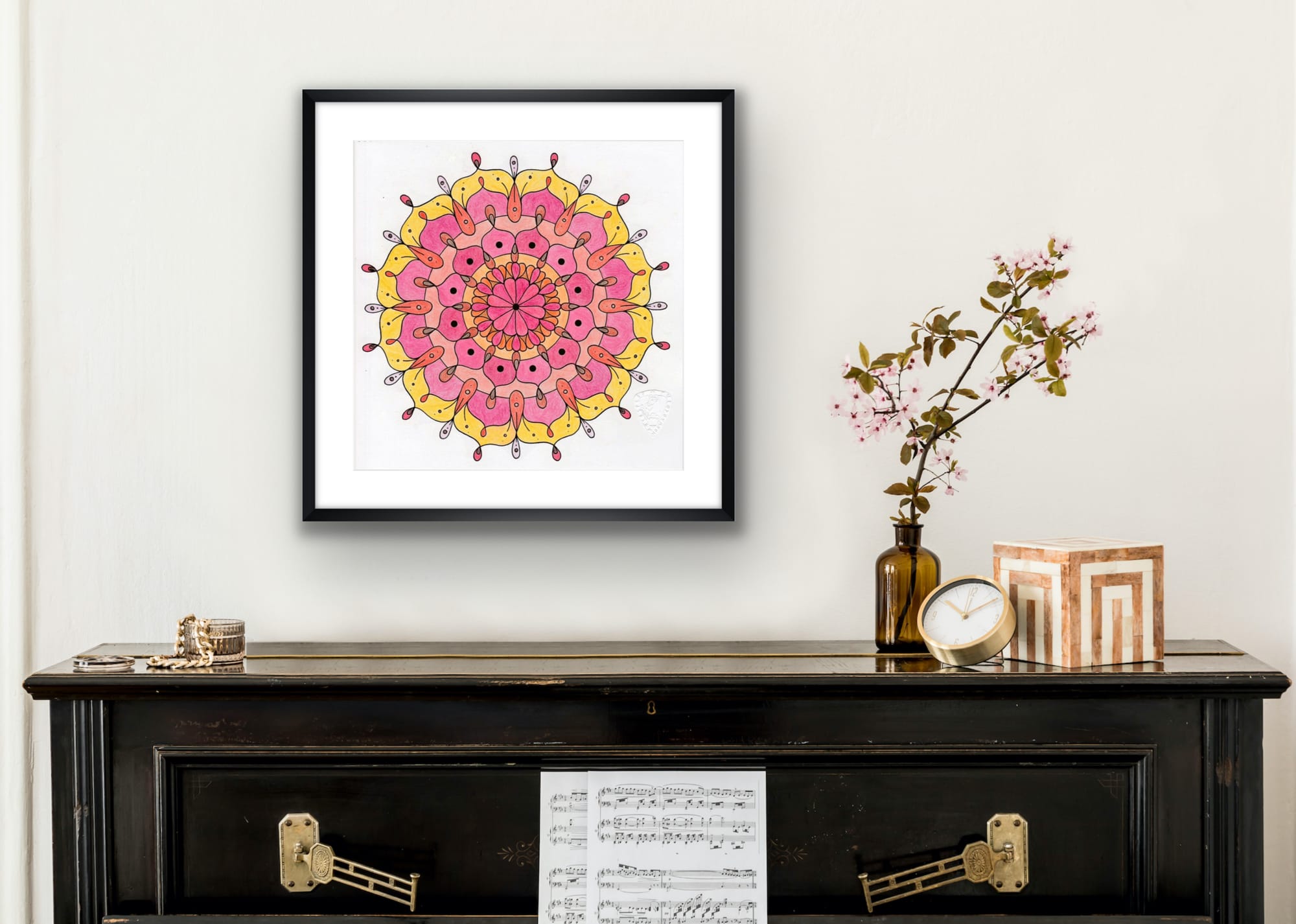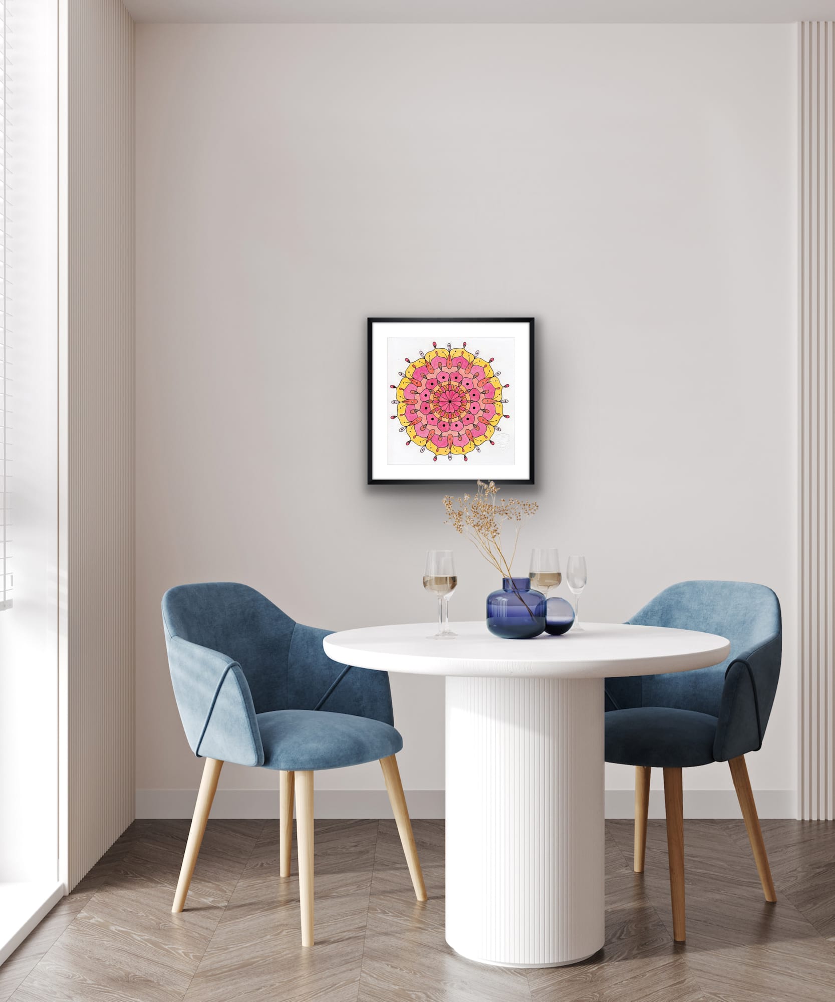 Erhellen Sie Ihre Umgebung mit dem Mandala-Kunstdruck "Sunflower" in limitierter Auflage und lassen Sie seine temperamentvolle Eleganz einen Hauch von Sonnenschein in Ihren Raum bringen.